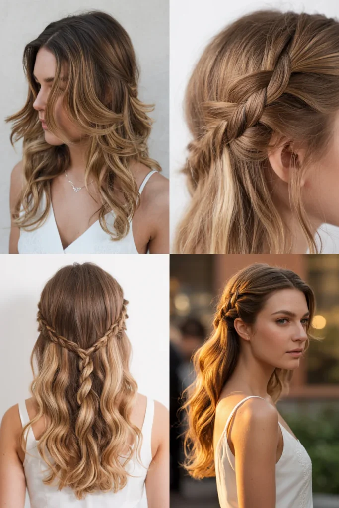 Romantic half-up waves blend soft texture with gentle structure, creating a balanced look that feels both polished and effortless. This style lifts the crown while allowing flowing lengths to frame the face beautifully. It works well for adding movement, enhancing volume, and offering versatility for both casual and formal settings.