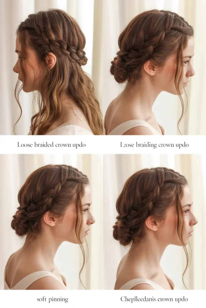 The loose braided crown updo wraps softly around the head, creating a halo-like shape that feels romantic yet relaxed. Its airy structure adds gentle volume while keeping hair secure, making it perfect for both casual days and special occasions.