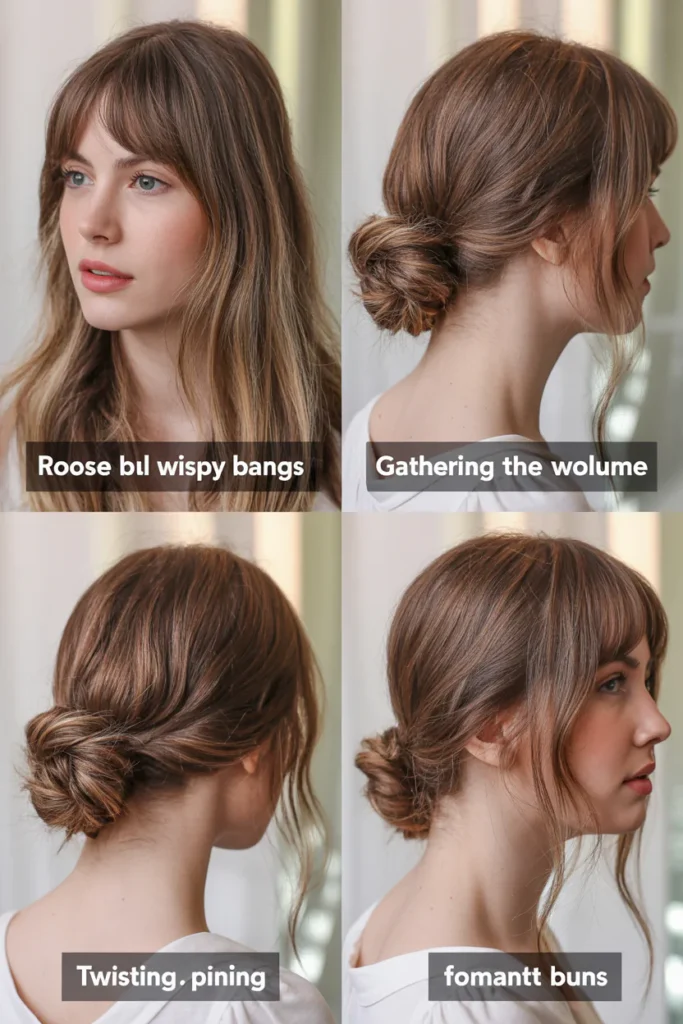 A romantic bun with wispy bangs combines soft structure with effortless charm, creating a delicate frame around the face. This style balances volume at the crown with airy fringe details, enhancing femininity while remaining practical for both casual and formal settings.