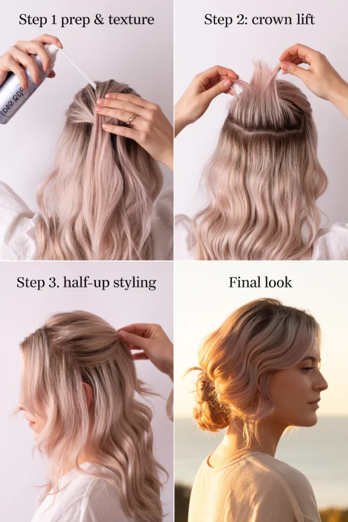 - The half-up structure creates the illusion of fuller, thicker hair, especially when the crown is gently teased and the waves are loosely defined.