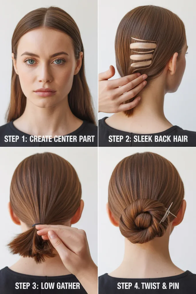 - Achieving this look involves blow-drying straight, applying smoothing serums, and securing hair tightly into a low bun with pins or an elastic for hold.