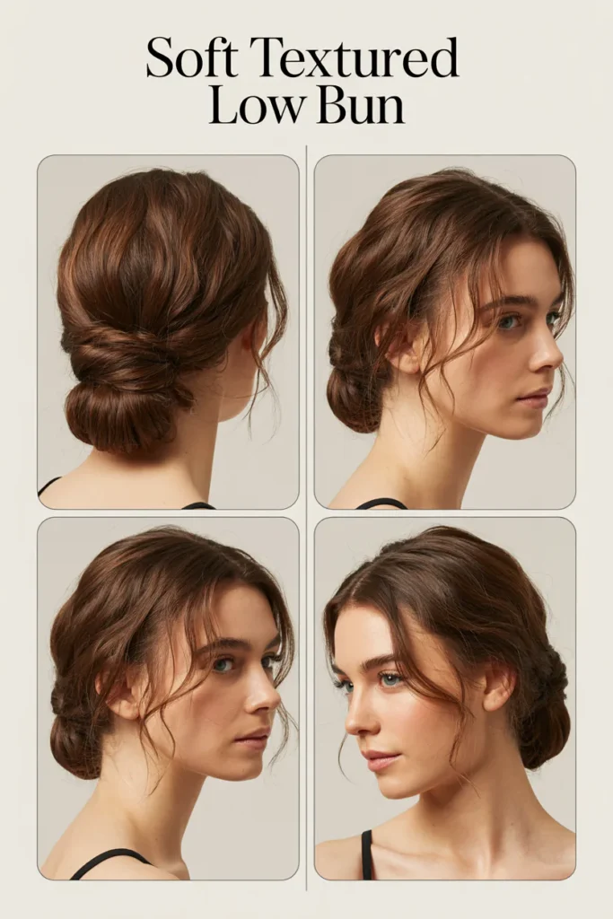 A soft textured low bun is a relaxed, loosely gathered hairstyle positioned at the nape, designed to create natural movement and effortless elegance. It softens facial features while offering a balanced blend of structure and undone charm. This style works beautifully for both casual days and polished occasions without feeling overly styled.