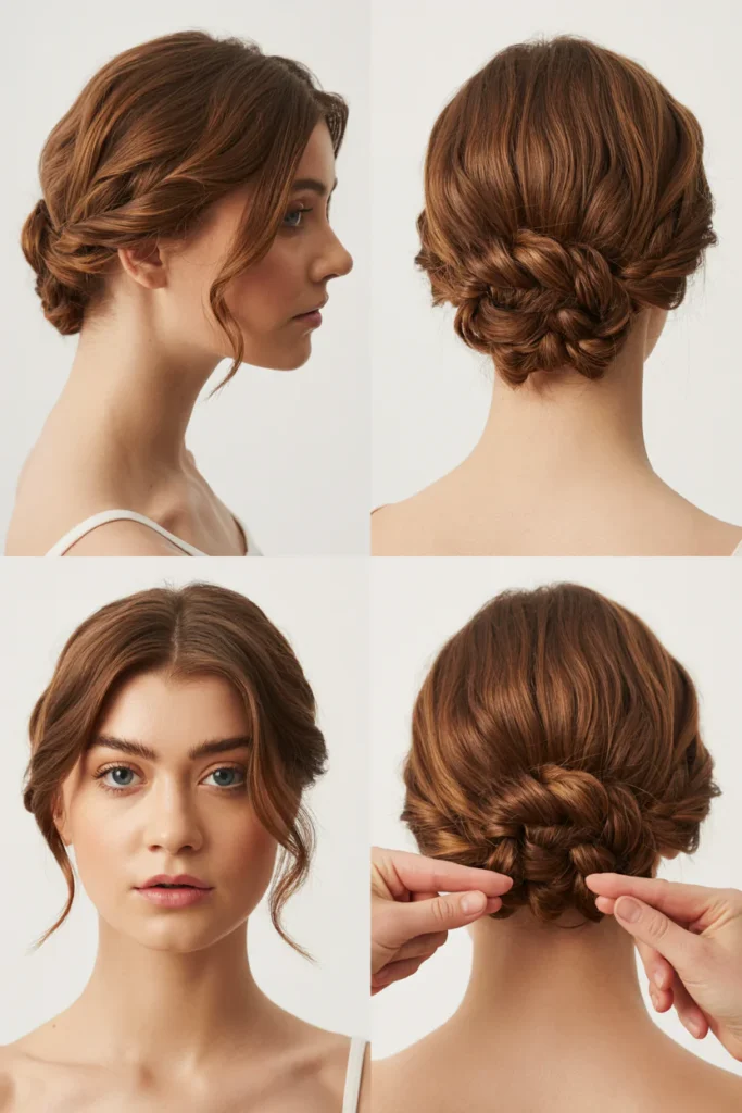 The knotted bun for medium hair creates a softly structured updo that blends texture with a secure hold. It forms gentle loops and twists that add visual depth while keeping the style compact, polished, and effortlessly wearable.