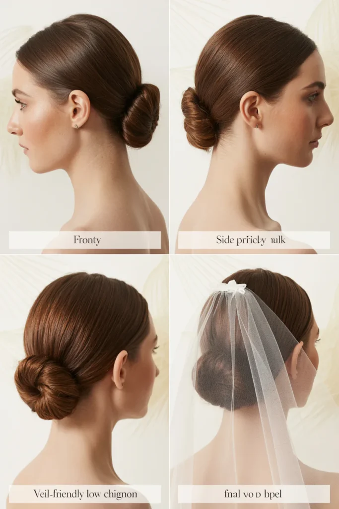 The veil-friendly low chignon is a sleek, structured updo positioned at the nape, designed to sit comfortably under a veil without adding bulk or distortion. It offers a polished silhouette while keeping hair secure, smooth, and elegant for long ceremonies and photographs.