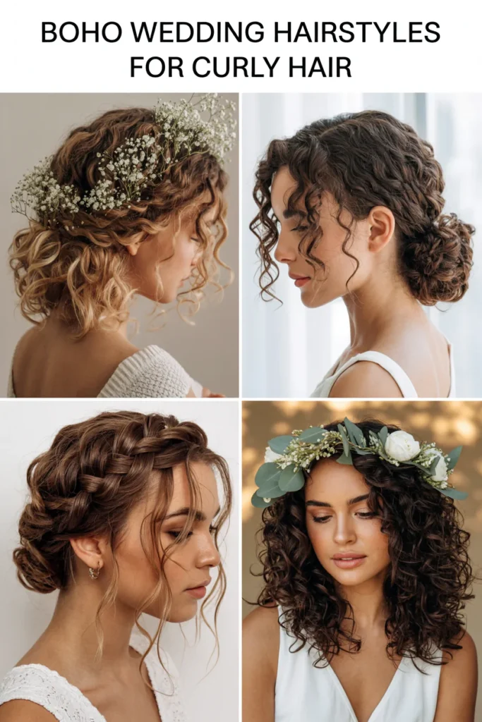 Boho wedding hairstyles for curly hair embrace natural texture while creating soft, romantic structure that feels effortless yet styled. These looks enhance volume, movement, and individuality, making them ideal for relaxed, outdoor, or free-spirited wedding themes.