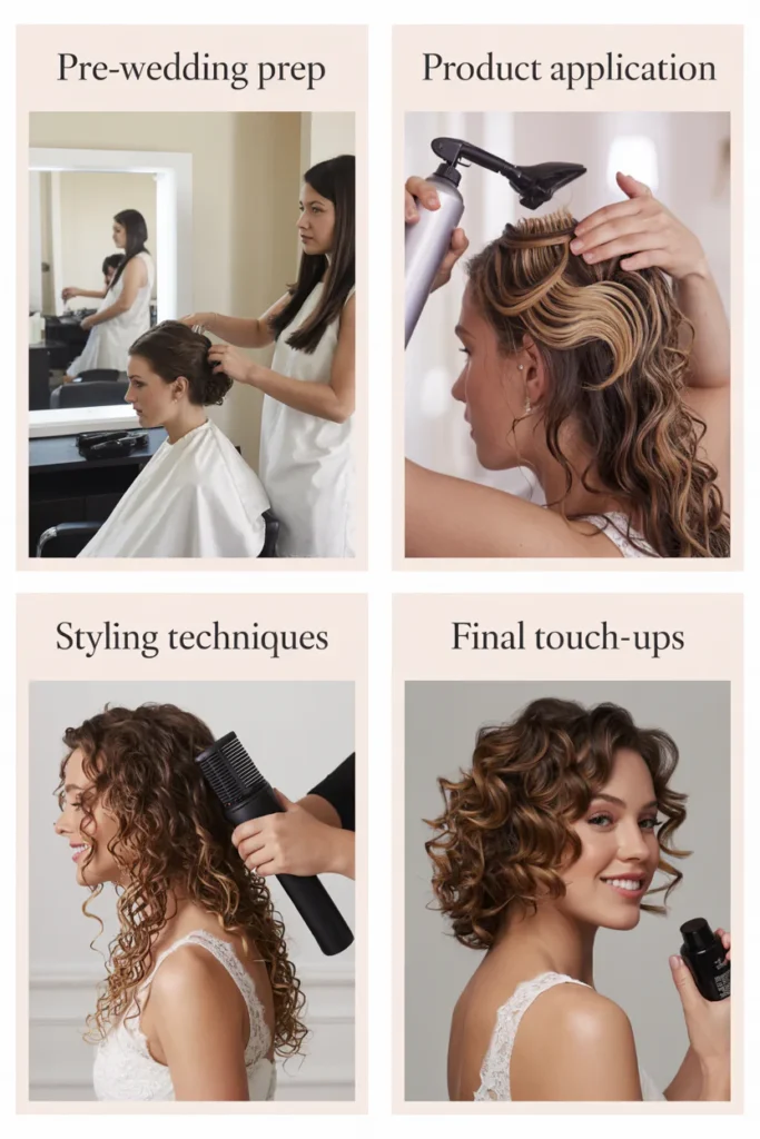 Start with hydrated hair, use your usual curl-friendly styling products, avoid heavy oils if your stylist prefers a lighter finish, and lock in the look with a flexible hold spray. Bridal prep guides also recommend deep conditioning, anti-frizz products, and satin protection the night before.