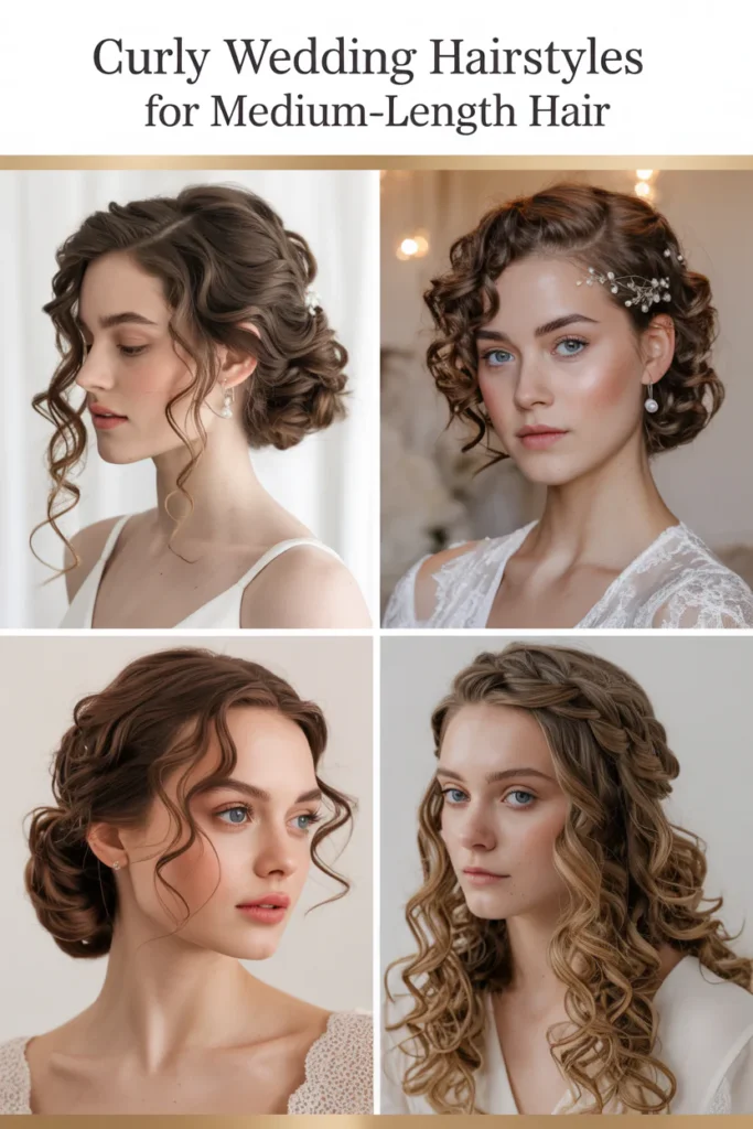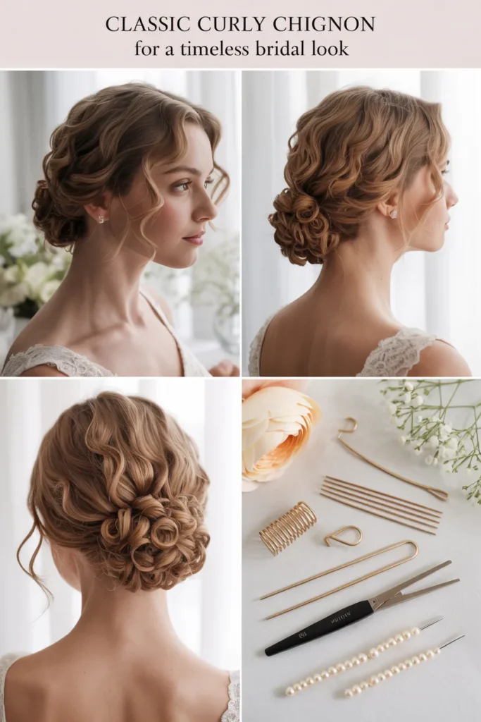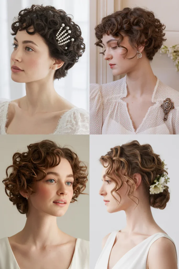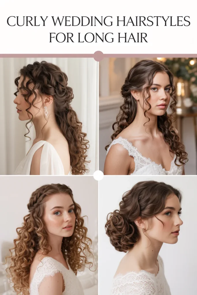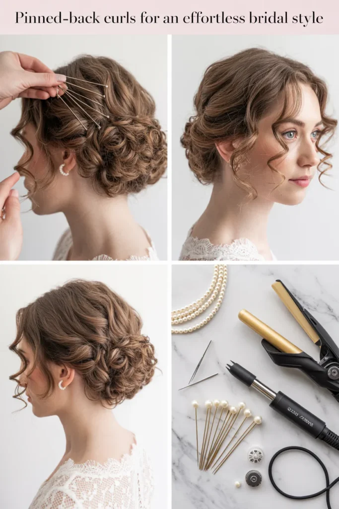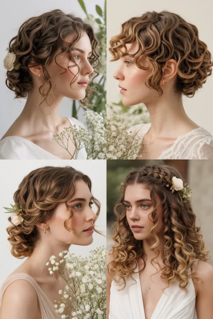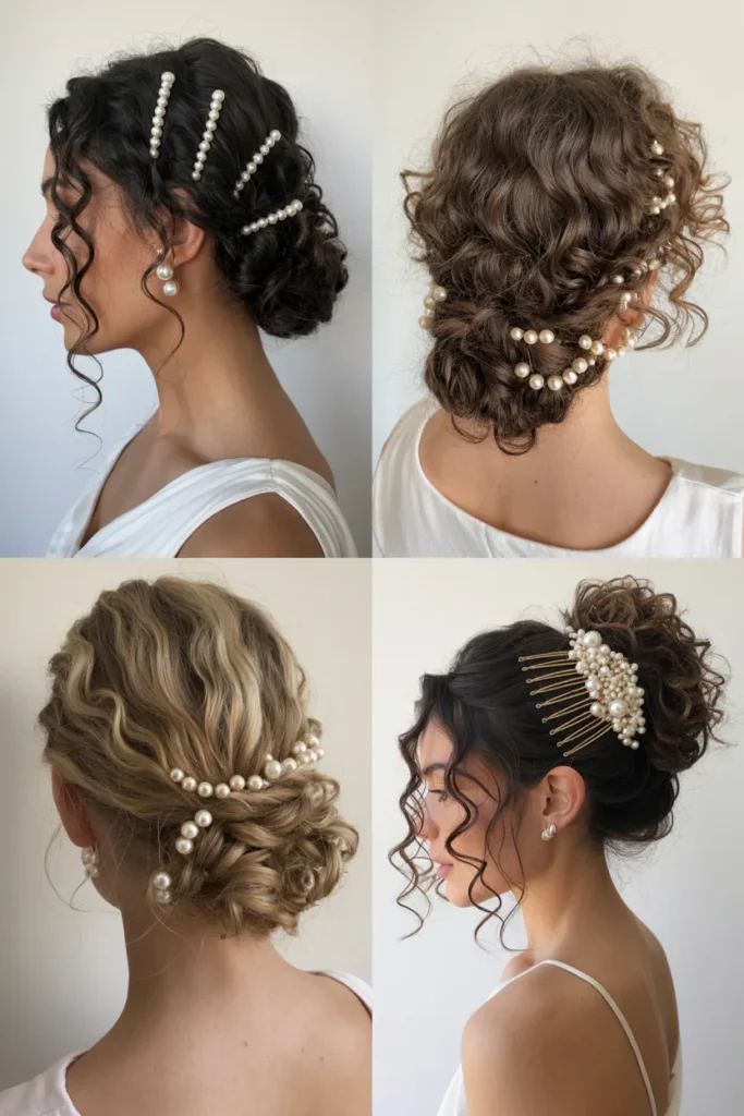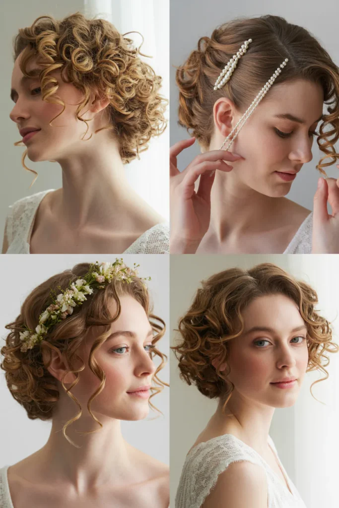 Pearl pins, floral accents, delicate clips, headbands, and veils work especially well with curly bridal hairstyles. These accessories highlight texture without overpowering it and are commonly recommended in bridal hairstyle galleries.