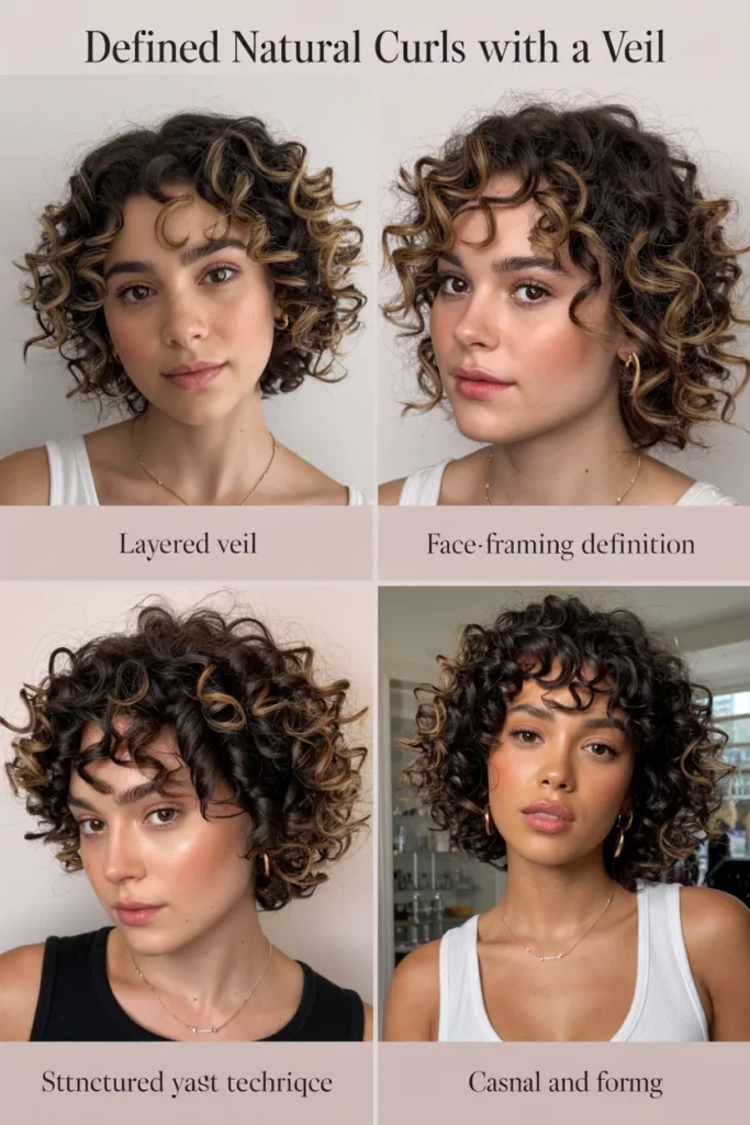 Defined natural curls with a veil create a soft, dimensional look that enhances natural texture while adding elegance through layered movement. This style frames the face beautifully, keeps curls structured yet touchable, and works seamlessly with both casual and formal aesthetics.