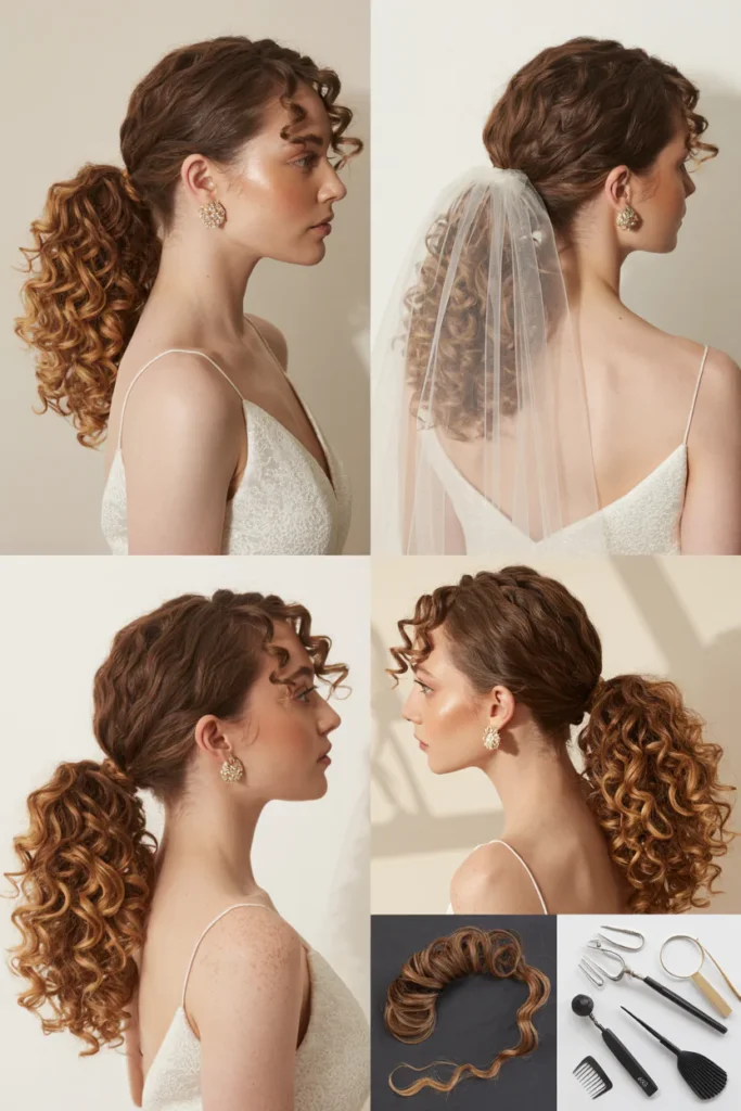 • Medium to long hair lengths are ideal, as they allow curls to cascade naturally, creating a fuller ponytail that enhances the bridal look with soft, structured layers.