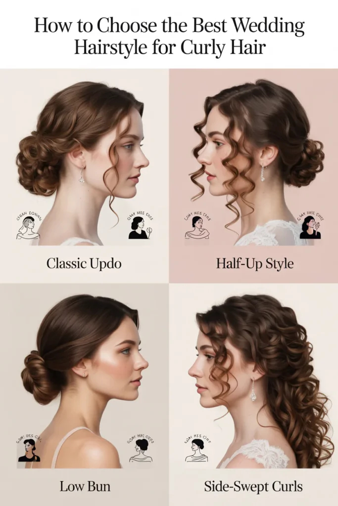 Choosing the perfect wedding hairstyle for curly hair is all about enhancing natural texture while balancing face shape, dress style, and overall bridal aesthetic. The right choice adds structure, controls volume, and ensures your curls look defined, elegant, and long-lasting throughout the celebration.