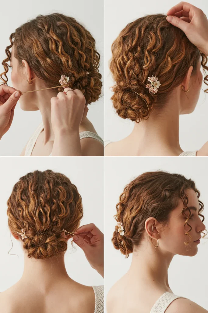 A loose curly bun with floral pins creates a soft, romantic updo that feels effortlessly styled yet polished. The relaxed curls add natural texture and volume, while floral accents enhance femininity and visual charm. This hairstyle works beautifully for both casual and formal occasions, offering versatility with minimal effort.