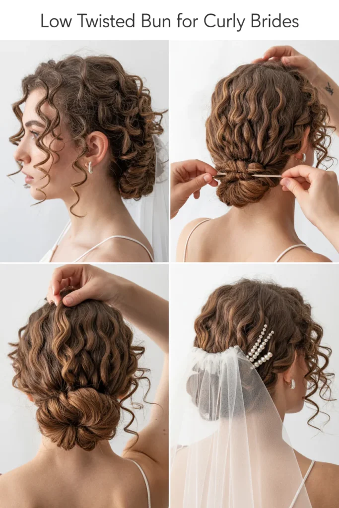 • Low curly buns provide a classic and timeless option, offering strong veil support while keeping the overall look neat, structured, and suitable for formal wedding themes.