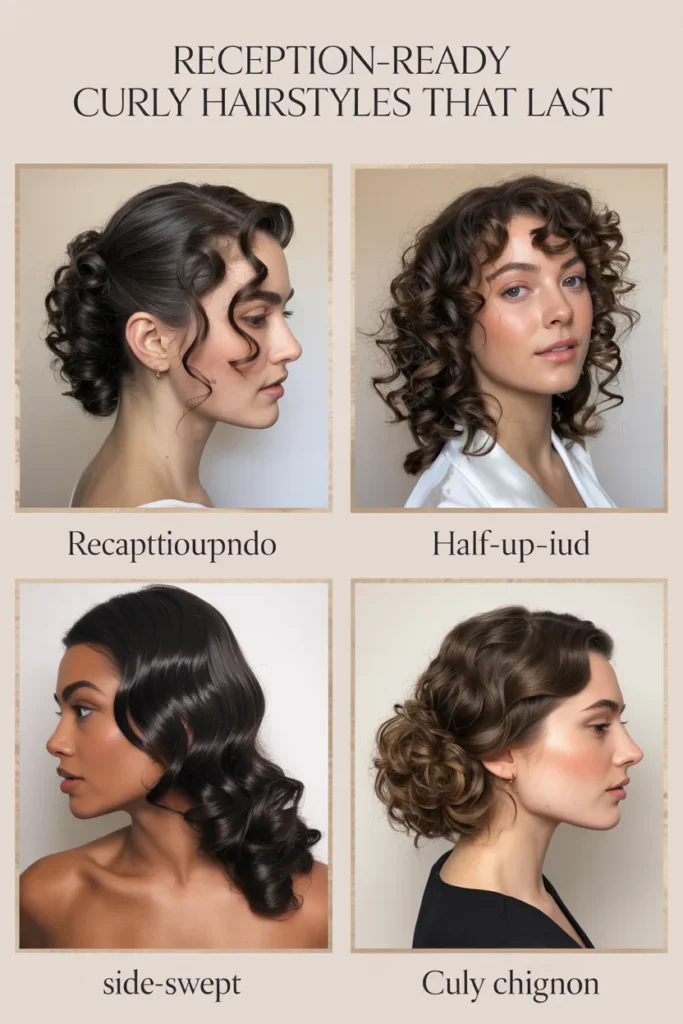 Reception-ready curly hairstyles focus on defined structure, lasting hold, and elegant volume that stays intact through hours of movement. The right shape, styling method, and product choice ensure curls remain polished, frizz-free, and camera-ready from start to finish.