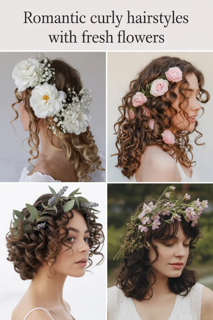 Romantic curly hairstyles with fresh flowers combine natural texture with soft botanical accents, creating an effortlessly elegant and feminine look. The curls add movement and volume, while flowers enhance visual interest, making the style ideal for weddings, dates, or outdoor events.