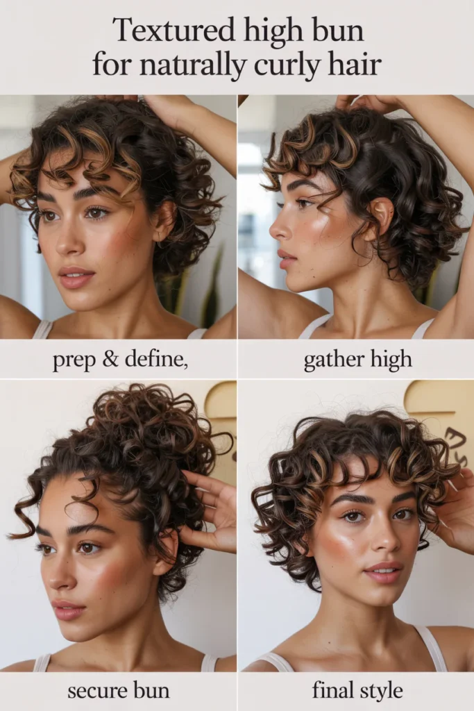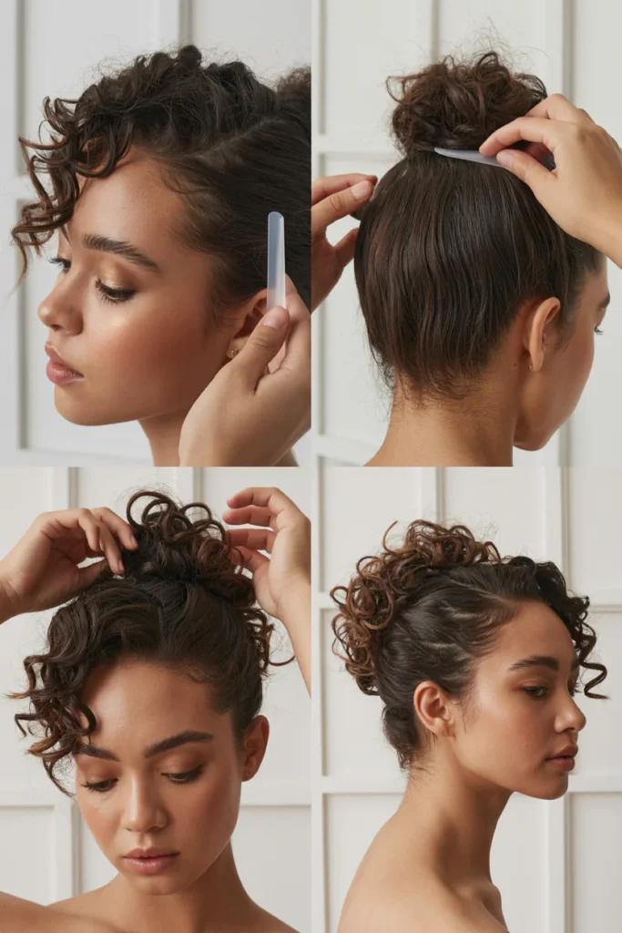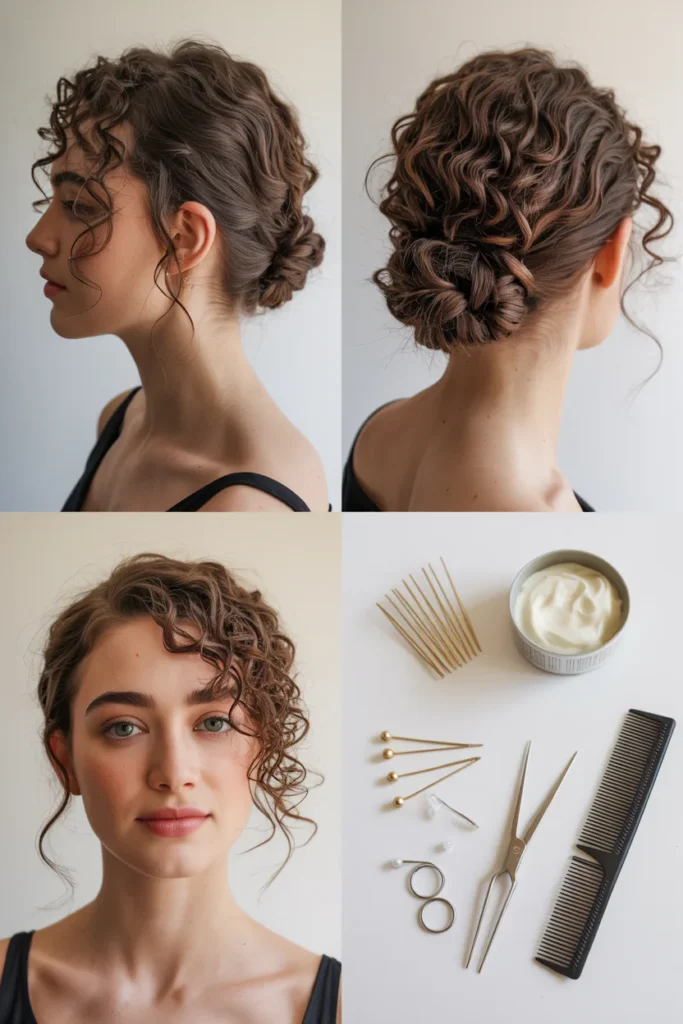 • Styling involves loosely pinning curls into a bun or twist, then gently pulling out a few strands around the face to create soft, natural movement.